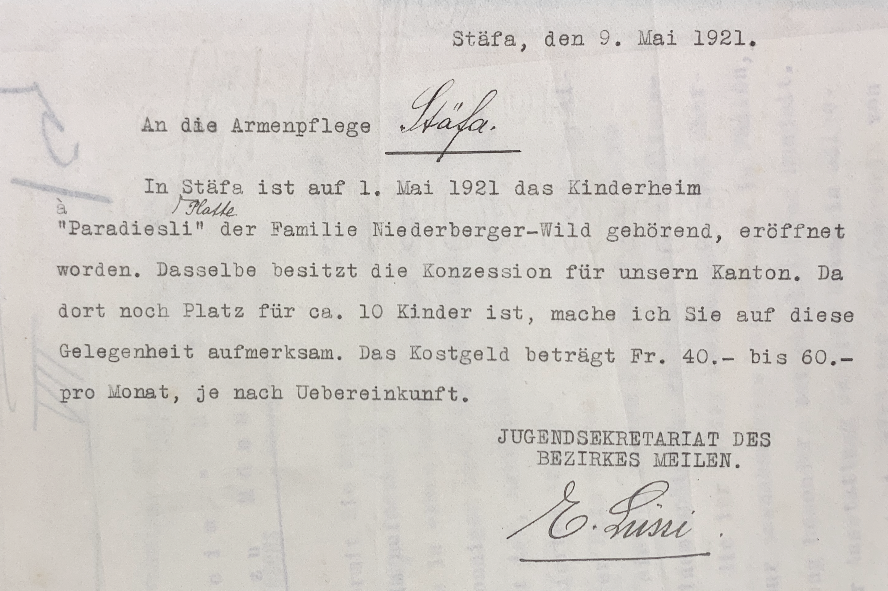 4. Dezember 2023Am 9. Mail 1921 wurde in Stäfa das Kinderheim mit dem verheissungsvollen Namen «Paradiesli» eröffnet.